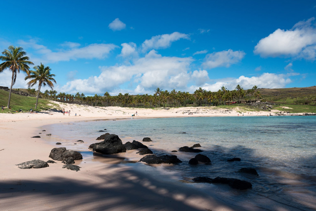 ✅ Playa de Anakena – Un paraíso de arena blanca, palmeras y aguas turquesas, donde se encuentran los moais mejor preservados de la isla.